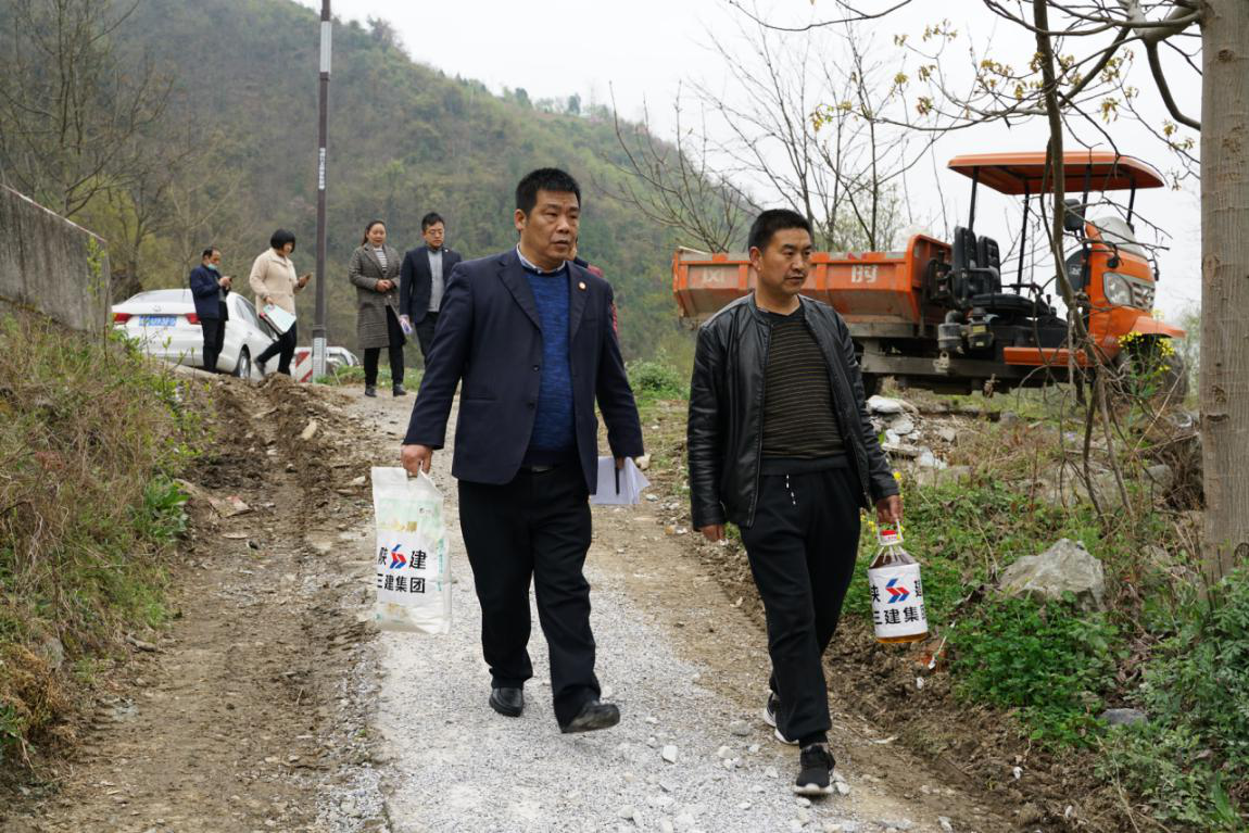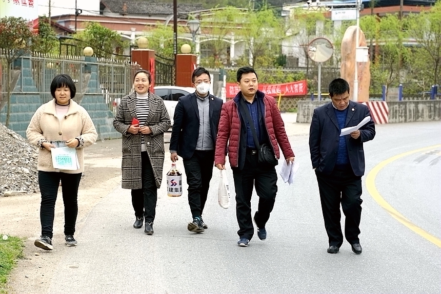 2020年3月30日,三建集團(tuán)扶貧工作小組成員劉小康,崔東旭,席鵬飛與略陽縣金家河鎮(zhèn)人民政府信息員吳霞徒步前往黃家溝村。