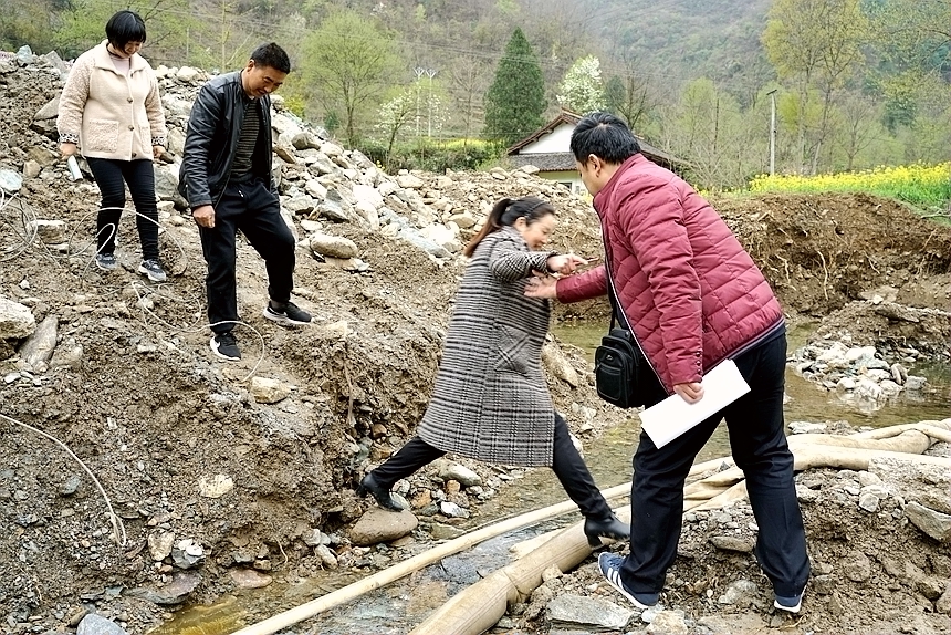 2020年3月30日,三建集團(tuán)扶貧工作小組與略陽縣金家河鎮(zhèn)政府工作人員前往黃家溝村途中跨越小溪。